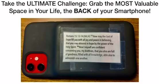 How about taking the ultimate challenge, grab the most valuable space in your life, at the back of your smartphone? This is the back of my phone right now. Here's the current passage I'm working on. It's Romans 15:13-14. I'll read it to you and then I'm going to pray. "Now may the God of hope fill you with all joy and peace in believing, that you may abound in hope by the power of the Holy Spirit." That's why we don't want to grieve Him. He is the power of our life. He's the one that helps us memorize. He's the one who helps us meditate. He's the one that helps us overcome the evil one. And this is what I say to you, "I'm confident concerning you, my brethren, that you are full of goodness..." that's what happens at salvation. "...filled with all knowledge..." that's what happens when we spend time in the word every day. And "...able also to admonish..." that's, placed the word of God in the hearts of others. "Admonish one another."