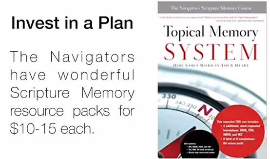 Some of you say that's too heavy for me, 52. Some of them are more than one verse, 105 verses total. So, you say that's too much for me. Here's another choice. Look at this, this is the navigators. The navigators are a wonderful scripture memory group started by Dawson Trotman. They have these topical memory cards. They're totally based on topics, and you can get a pack of them for $10 to $15 each. Each packet has anywhere from, I don't know, 15-20 verses. I'll show you what those look like. In fact, right here in my zipper pack to learn navigator verses, I have them all torn up and put on a little clip. This is: Live the New Life. That's one of these topical memory systems.