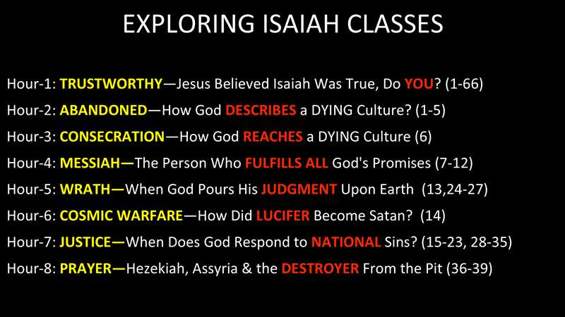 In our 15 hours, I'm going to first survey the whole book with you on the trustworthiness of the Bible because Jesus believed Isaiah was true. Isn't that neat? And all the New Testament writers believed it was true. Number two, God describes what a culture looks like that's dying, and that'll be our second lesson. What happens when a culture abandons God? And what you're going to see is the eerie similarities between Western society today and Israel back then. Then, how does God reach a dying culture? That's chapter 6 of Isaiah. 1-5 shows the dying culture. God basically says it's corruption just rotting, as I called it. How do you reach it? God says, when a culture abandons God, I need people that will be like Isaiah in chapter 6.