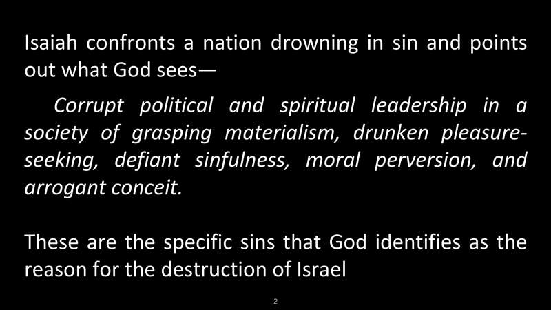They were drunken. It says that they drank their wine not out of a cup. They drank it out of a bowl. You understand? They really were loving to drink. They were pleasure seeking. They were defiant in their sinfulness. They were morally perverse. In fact, there's an Old Testament word, Kadosh, that was used for males pursuing males. And it said that there was great, what we would call today, homosexuality, that was a moral perversion. Plus, they were arrogant and conceited. I don't know if you've ever seen a proud person. Bonnie and I were traveling, and we went through an airport, and there, there was this group that walked through the airport, and they just walked through and bumped everybody like no one else was in the airport. They acted like they were the only ones there, and they just were, you could see on their faces, they were so arrogant and conceited, and they just pushed everybody out of the way. That's what the whole nation of Israel was like, and those are the specific sins that God identified for why He sent the Assyrians, and the Babylonians, to judge Israel. So that's what the book of Isaiah is about.