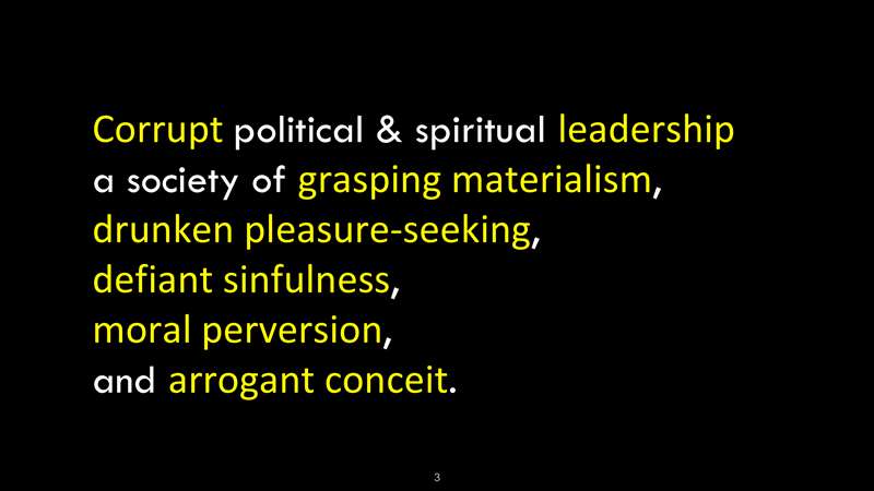 Corrupt political and spiritual leadership in a society of grasping materialism, drunken pleasure-seeking, defiant sinfulness, moral perversion, and arrogant conceit.