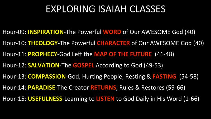 Paradise. What happens when, and this is Isaiah 59 to 66, what happens when the Creator Messiah returns? God tells what the world will be like. And then finally, the last lesson, we're going to survey the book again, all 66 chapters, and talk about how to be useful and listening to God.