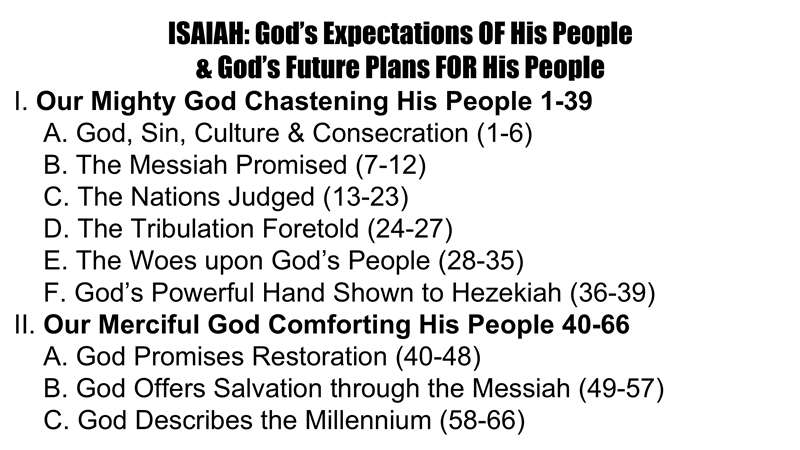 Now, this is in your notes. Jesus believed Isaiah was true. And my question to you is, do you? Here's the outline that's in your notes. And the outline of Isaiah completely parallels the Bible. How many chapters are in Isaiah? Yes. (Student responds to Dr. Barnett.) How many books are in the Bible? (Student responds to Dr. Barnett). Isn't that interesting? The whole layout of the book of Isaiah parallels the Bible. The first 39 chapters of Isaiah is about God chasing His people. The last chapter, starting in chapter 40 through 66, is about God comforting His people.