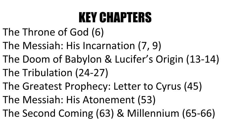 Here are the key chapters, and by the way, some of these will be on your Isaiah test. Isaiah 6 is the throne of God, the Messiah's in 7 and 9, the doom of Babylon and Lucifer's origin is 13 and 14, the, we call this the mini-Tribulation it's what Jesus quotes in the sermon that He gave about the Tribulation. Probably the greatest prophecy, the most amazing one, is God names a future ruler 200 years before he's born. It would be like me saying in the 1500's that a guy named George Washington was going to be coming to liberate America from Britain. If I'd have said that in 1500, everyone would look at me. Britain was the ruler of the world, and I'm naming a person? God named, by name, the ruler of the Medo-Persian Empire, Cyrus, and He says, you're my servant, and you're going to let My people build their temple. That's chapter 45, the greatest chapter, and then the Second Coming of Christ in the Millennium, and it's 12:30, and we'll pick up tomorrow, right there, or whenever I do this again.