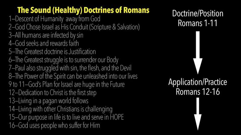 Sound or healthy doctrine. What do I mean by that? Remember the book of Titus, if you've studied that with his talks about sound, it's hugiainó, healthy doctrine. What are the healthy doctrines of Romans? Number one, humanity descended away from God. Tomorrow when we cover that chapter, we're going to see what happened, what humanity did, especially in not only the fall into sin in the Garden of Eden, but when God gave humanity a brand-new start through Noah, they went right back and even worse. And that's all chronicled in chapter one. And it just basically shows us anthropology and the history of religion in the world.